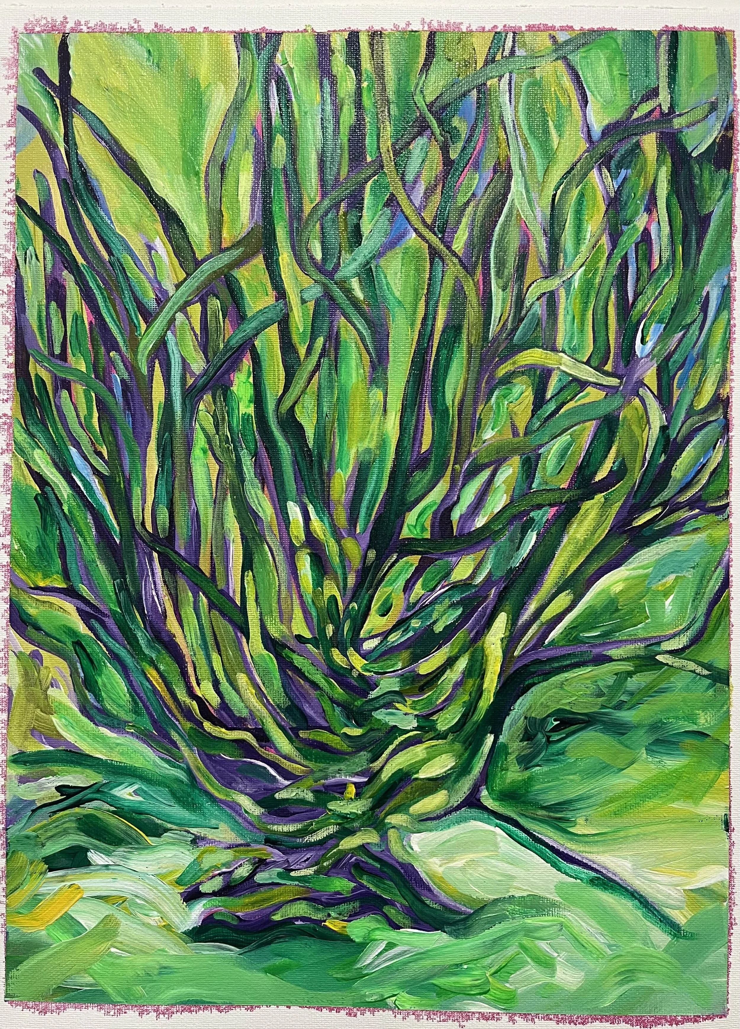 The Garden in the morning, one August, 2025. Acrylic and oil on Canvas, 24” x 30”.